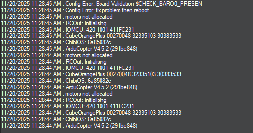 For diagnostic purposes, I disabled the board validation by setting BRD_OPTIONS=128. Then rebooted the cube… and everything boots perfectly fine. The error is gone, and all BARO readings are stable and accurate, BARO_Health=1. If the BARO is actually operating correctly, why is it failing the board validation on startup?