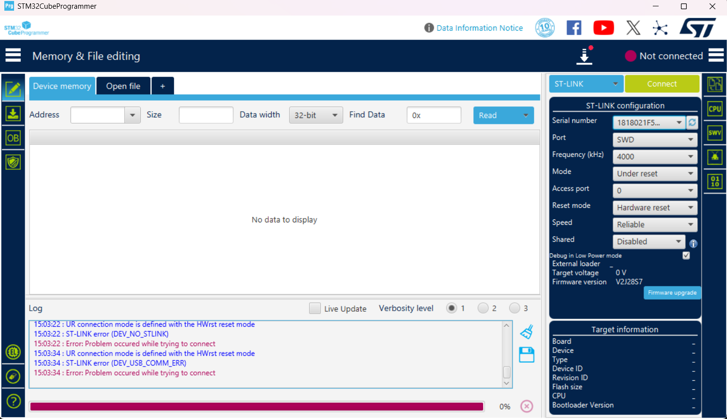 This is setup for bootloader using sur connector with st-link v2, it is showing the connection error, i am windows , does it window issue? or something else