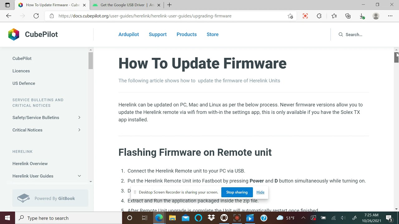 I dropped this air unit off to a computer expert because I was having difficulties in getting the firmware update going & he explained that he downloaded the “Google USB Driver” on my laptop & performed the necessary firmware update to the Herelink Air unit. I was unable to bind the remote with the air unit upon receiving the u it back so my only assumption is that maybe the forward update wasn’t performed properly. When I hook up my the Herelink air unit & I try to personally flash the firmware this is what pops up!